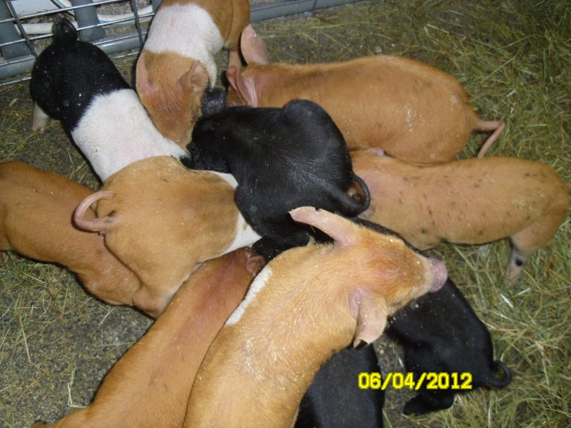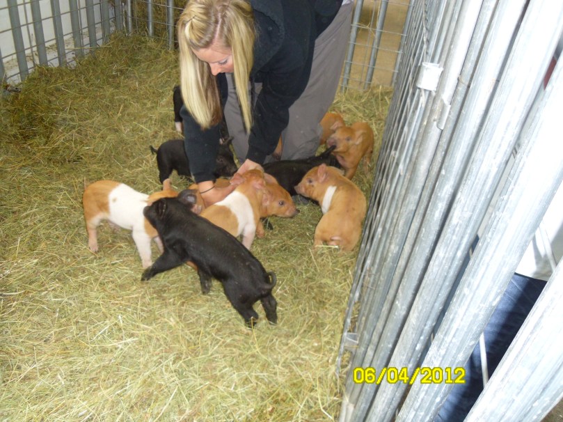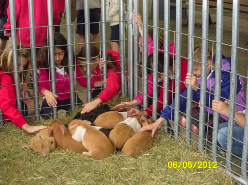 Addison and I have helped on various stations, including sheep (where the kids made their own Ojo de Dios craft with 100% wool yarn) and the goat station (where my own goats were on exhibit for the kids to pet). This June we were once again placed on the pig station with our wonderful station leader Laura. Our station actually had piglets for the kids to pet after they heard a talk about pigs and labled where pigs originated on a map.